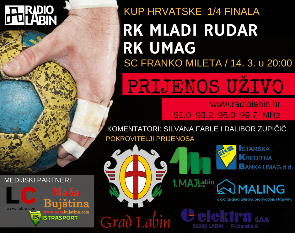 Rukometni klub Mladi Rudar i Rukometni klub Umag odmjerit će snage u velikoj utakmici u labinskom Sportskom centru Franko Mileta 14. ožujka od 20 sati. Cijeli spektakl prenijet će i ekipa Radio Labina u izravnom prijenosu koji započinje uvodnom emisijom u 19:45, a završit će se nakon utakmice analizom susreta. Komentatori susreta su profesionalna novinarka i voditeljica Radio Labina Silvana Fable i Dalibor Zupičić, poznati i renomirani te bivši prvoligaški rukometaš.