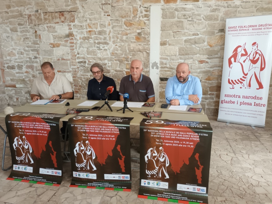 Danas su na tiskovnoj konferenciji održanoj u prostoru ECPD-a u Puli Josip Percan, predsjednik Saveza folklornih društava Istarske županije, pročelnik Upravnog odjela za kulturu i zavičajnost Istarske županije Vladimir Torbica, Pietro Demori u ime talijanske zajednice i Gaetano Benčić kao predstavnik domaćina, najavili 59. Smotru narodne glazbe i plesa Istre koja će se održati na školskom igralištu u Taru u nedjelju, 31. kolovoza 2025. u 19,30.