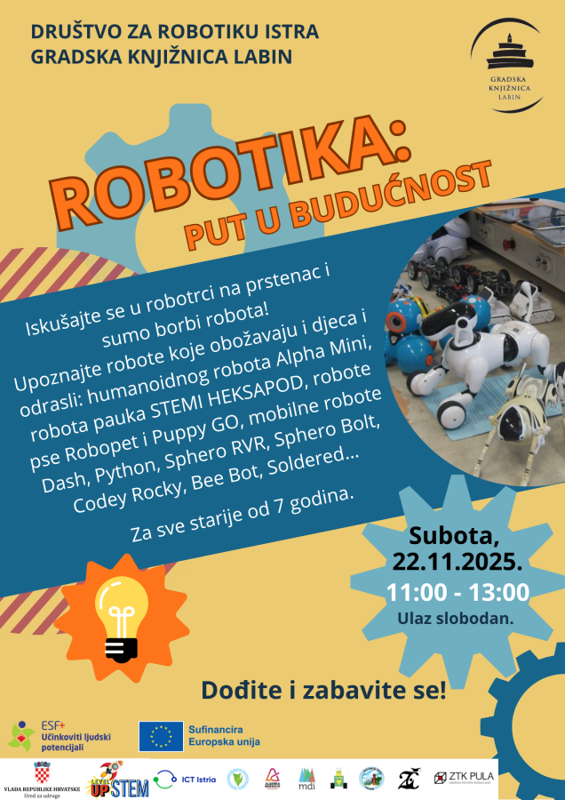 U subotu, 22. studenoga, od 11 do 13 sati u Gradskoj knjižnici Labin održava se besplatna robotička igraonica „Robotika: Put u budućnost“. Posjetitelji će upoznati robote i okušati se u robotrci i sumo borbi.